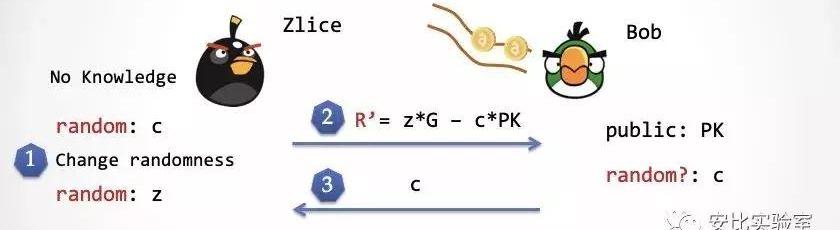 首先Bob必須給出一個「隨機」挑戰數,然后Bob在橢圓曲線上同態地檢查z。如果我們把挑戰數c看成是一個未知數,那么r+a*c=z可以看成是一個一元一次方程,其中r與a是方程系數。請注意在c未知的前提下,如果r+a*x=r'+a'*x要成立,那么根據Schwatz-Zippel定理,極大概率上r=r',a=a'都成立。也就是說,Alice在c未知的前提下,想找到另一對不同的r',a'來計算z騙過Bob是幾乎不可能的。這個隨機挑戰數c實現了r和a的限制。雖然Bob隨機選了一個數,但是由于Alice事先不知道,所以Alice不得不使用私鑰a來計算z。這里的關鍵:c必須是個隨機數。