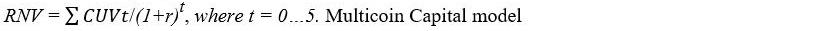 Burniske和Winton的模型事實上只考慮了主觀選定的某一未來時間段,這一點最讓我們困擾。該模型預測了某個公鏈在網絡成熟之前的所有年份的CUV?。之后,該模型只對其主觀選擇的某一年的CUV進行折現,實際上忽略了所有中間和后續CUV,使所有用于推導它們的復雜計算變得無關緊要。