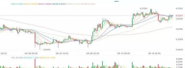EOS主網升級臨近,短線投資者可以暫時先撤出觀望,利好落地即是利空。EOS支撐位3.8USDT,壓力位4.25USDT。