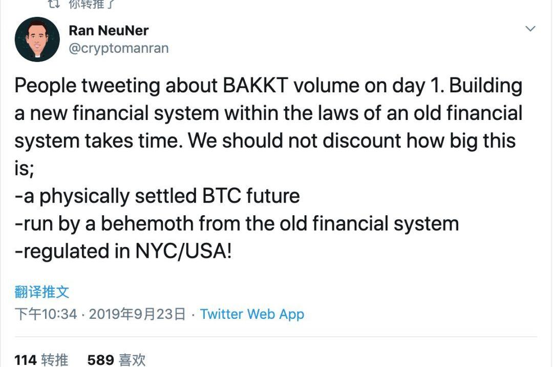 首日成交量低迷,CNBC加密頻道主持人RanNeuNer評論道:人們發推談論Bakkt第一天的成交量。在一個舊的金融系統的法律體系下建設新的金融系統需要時間。我們不應該忽視這件事的重要性: