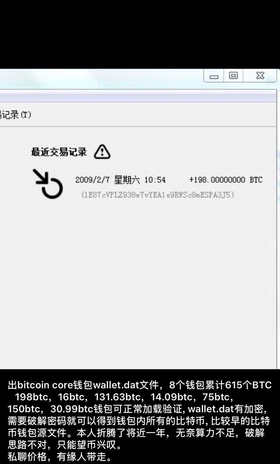 前不久有一個騙局特別流行,與該事件有異曲同工之妙。曾有用戶四處出售bitcoincore錢包wallet.dat文件,8個錢包累計約615個BTC。主要幾個錢包的資金為:198BTC、131.63BTC、75BTC、150BTC等錢包可正常加載驗證,但是wallet.dat也是加密過的。幣主折騰了近一年,因為算力不足,破解思路不對,遂尋求圈內好友協助共同破解。