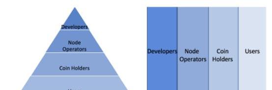 雖然利益相關者在區塊鏈上涉及各種利益,但他們可以大致分為四類:開發人員、礦工、用戶和代幣持有者。