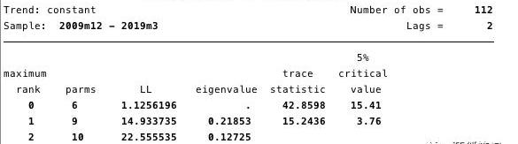 接下來,我們需要確定是否存在協整關系,Johansen框架是很好的工具。