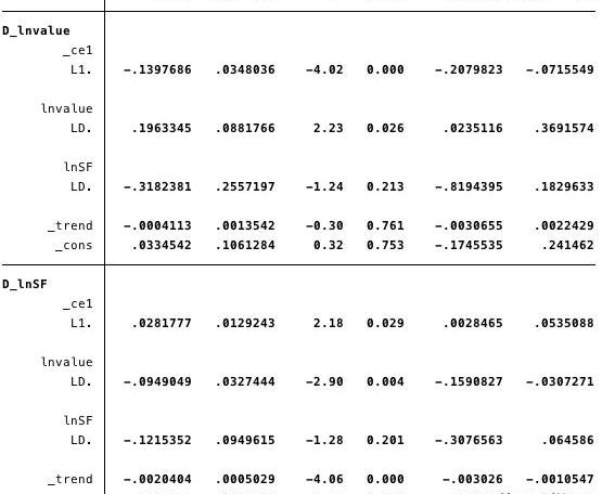 總的來說,結果表明該模型非常適合。協整方程中的ln(SF)系數和調整參數都具有統計顯著性。調整參數表明,當協整方程的預測值為正數時,由于協整方程中的ln(value)系數為負,ln(value)低于其平衡值。系數L.ce1的估計值為-0.14。