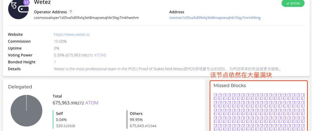 而即便在18小時連續漏塊前完成了節點修復、恢復出塊,漏塊時間內的收益依然無法彌補,對委托人而言無疑也是非常大的損失。以BouBouNode節點為例,其昨晚兩次長時間漏塊總計約8小時,以總委托額為204萬ATOM、年化10%的收益率計算,8小時損失的收益在185ATOM左右,8小時即損失500美金。