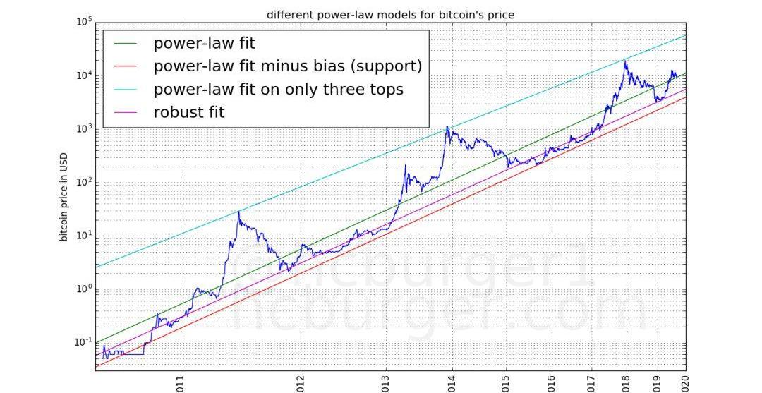 備注:通過在對數空間進行線性回歸,我們獲得了一個預測比特幣價格的非線性冪律。