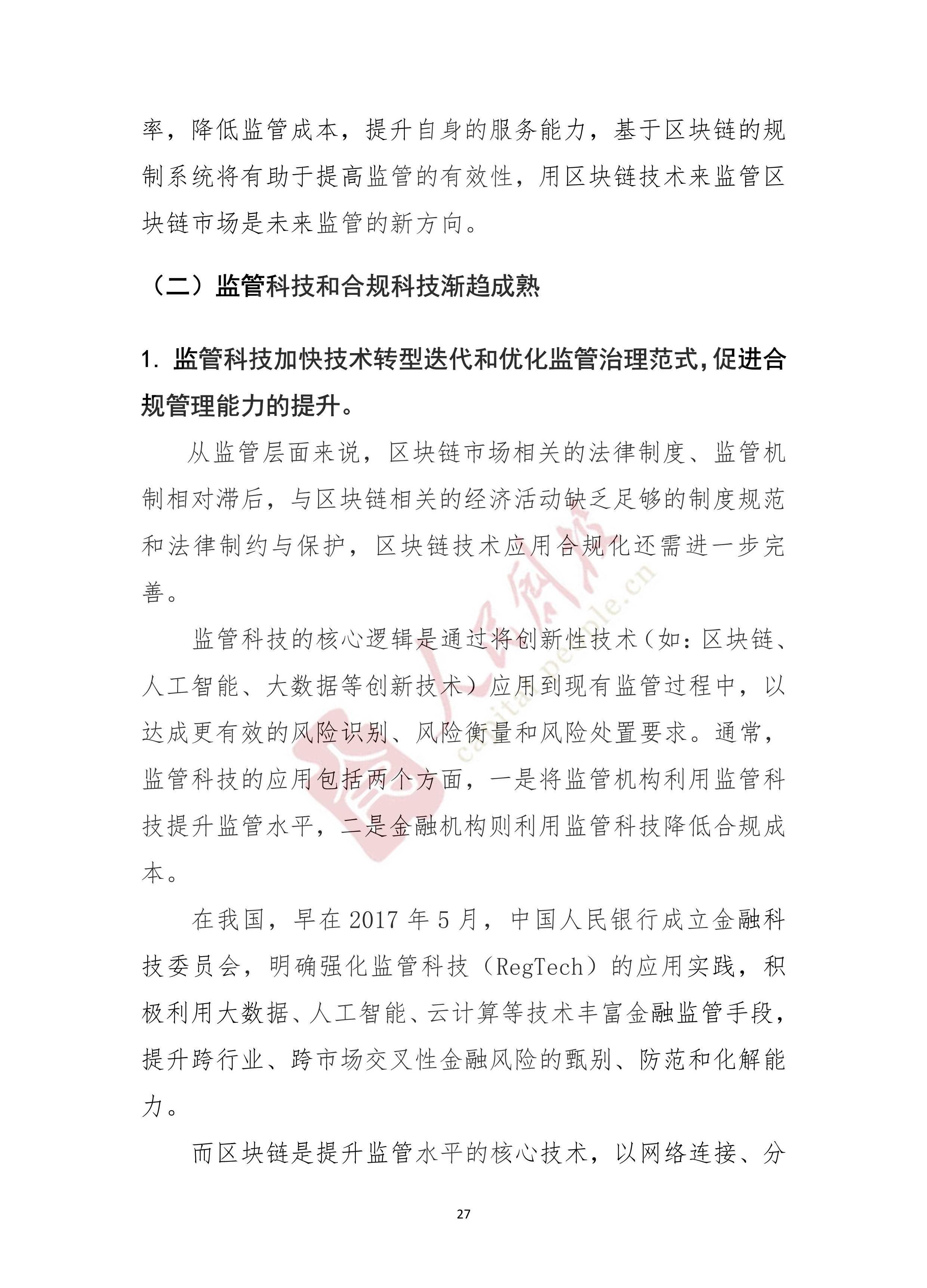 該報告第一部分梳理了中國區塊鏈政策主要現狀及發展歷程,理清區塊鏈政策發展路徑;第二部分和第三部分主要對我國區塊鏈政策進行了全方位的盤點和梳理,以全面了解中央和地方區塊鏈政策現狀;第四部分和第五部分主要是基于前三部分的內容,對我國區塊鏈監管政策和扶持政策的方向和趨勢做了深度分析,從市場監管、信息管理、服務提供、加密資產管理等多個維度總結了區塊鏈監管趨勢;此外,還分別從中央單位、技術層面、產業層面、以及行業應用層面分析了區塊鏈政策發展趨勢,為相關政府部門、行業企業、服務機構及其從業人員提供參考。