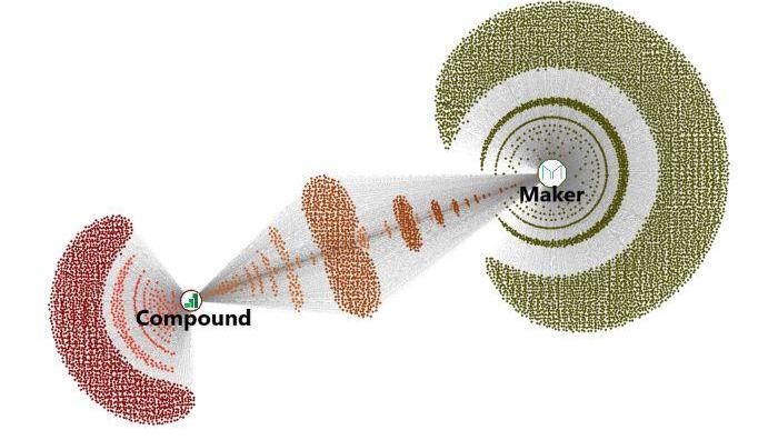 乍看之下,我們會注意到這兩個平臺之間的大小差異,二者之間龐大的地址數量以及在代表Maker和Compound的節點周圍形成的環狀物。讓我們描述一下這幾組地址,以便更好地理解上圖的內容。首先,可以把Maker和Compound的節點想像成具有某種“引力”。與它們靠得越近的節點,產生的交互也會更多。