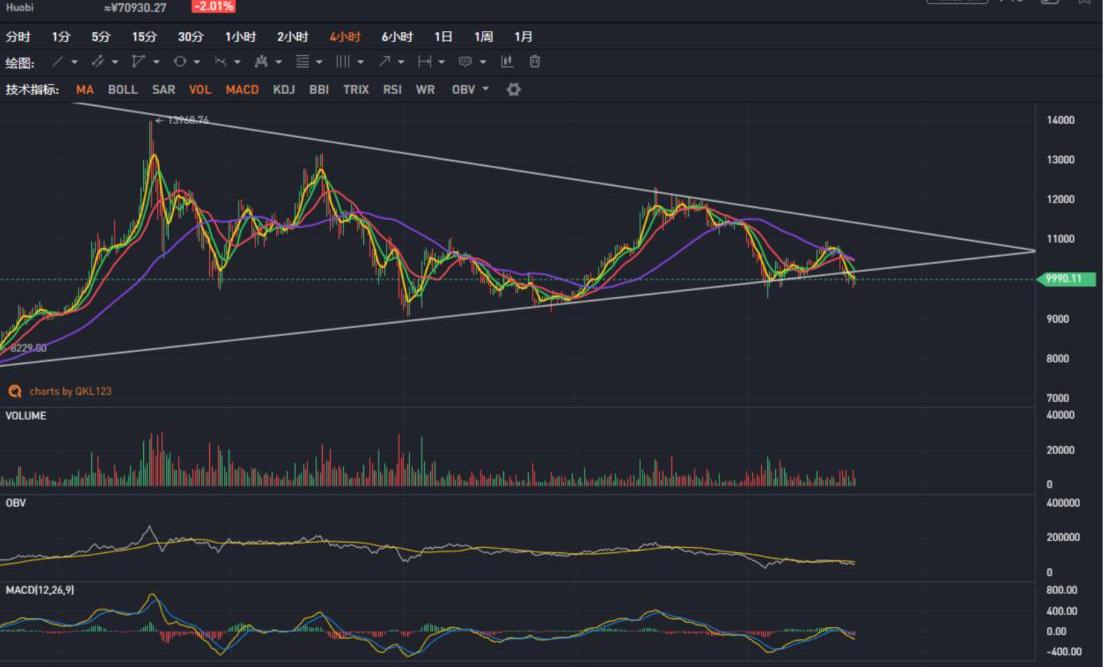 昨日BTC下探到10200美元后小幅震蕩,并于今日09時放量下探至9765美元,空軍暫時得到壓制,但上攻勢頭明顯不足,短時不確定性增加。從4小時K線來看,目前BTC處于短期收斂三角的下延地帶,若短時不能向上收斂則有走壞的可能,需繼續觀察量能方向以做判斷。