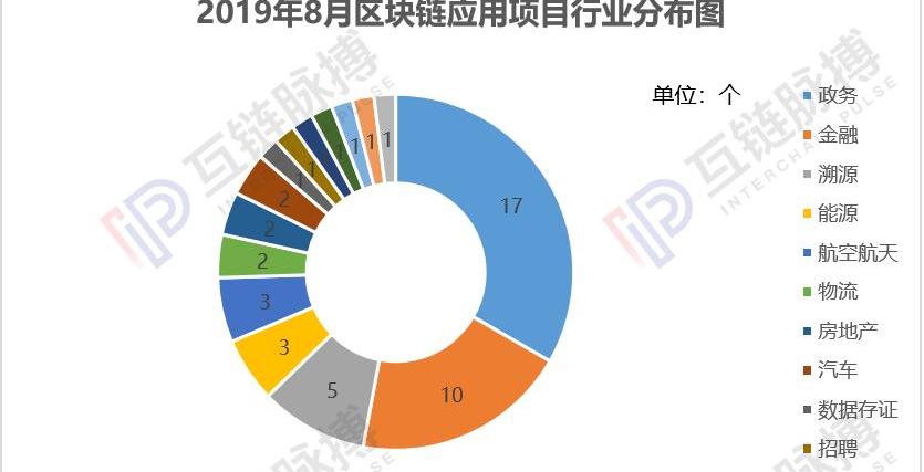 互鏈脈搏研究院統計數據顯示,2019年8月,政務、金融兩大領域披露的應用項目數量分別為17個和10個,占比分別為32.7%、19.2%。