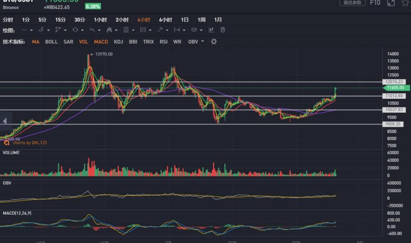 今日受市場避險情緒的影響,BTC攻上11000美元,短時有所放量,有繼續上攻12000美元之勢。但12000美元附近面臨較強壓力,看量能方向而動,不宜追高。