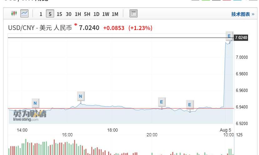 8月5日早間,人民幣對美元匯率顯著走低。離岸人民幣匯率日內跌幅一度擴大至1.85%;在岸人民幣跌幅也出現顯著擴大。