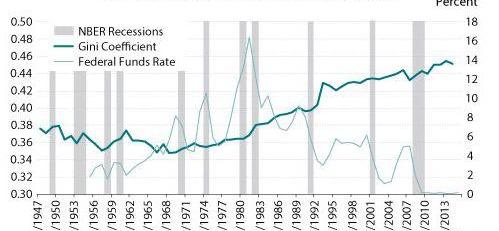 低利率帶來的美國財富轉移,可以從不斷擴大的貧富差距中反映出來。基尼指數,被用來衡量一個國家的不平等程度,自20世紀80年代以來,它與美聯儲基金利率呈高度負相關。也就是說,當利率下降時,它會提高富人擁有資產的價格,并擴大貧富差距。