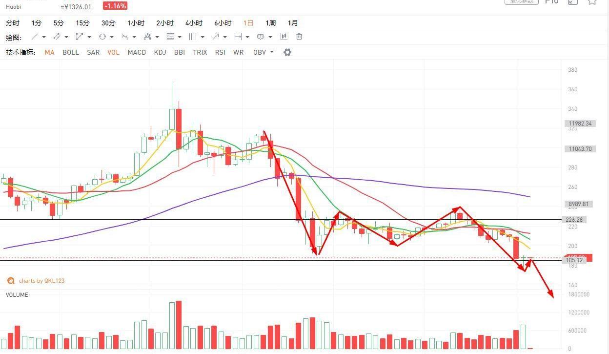 ETH跌穿前期的低點,目前還沒有收回的跡象,若是再次站回200美元的支撐位,則可能會向上挑戰230美元附近的壓力為,若是在這個地方橫盤幾天,沒有向上的欲望的話,可能會繼續向下殺,我們認為該標的目前的風險還是比較大的,切勿盲目抄底,建議謹慎觀望。