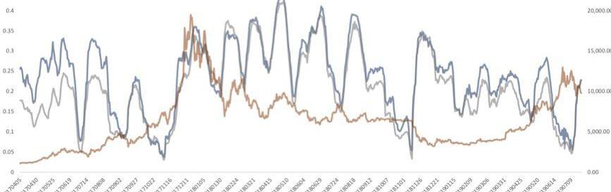 從比特幣波動率特征來看,目前市場階段正處于30天波動率的高點,但出于365天波動率的低點,和2016年的1月與7月波動特征最為類似。未來一個月內,30天短期波動率必將下行向低位回歸,這意味著比特幣在短線反彈后將保持月級別的震蕩下跌趨勢,持續向MA120靠攏。從年波動率來看,年波動率已經進入歷史底部區域,未來將大概率向上拐頭,比特幣將在后半年持續創出較大的寬幅震蕩,大概率在2019年9-10月將重拾升勢。