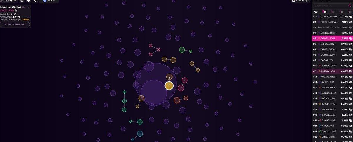 再來看看今早抓住的開盤10倍幣,160GAS費下的金狗,#CLIPS這個分散度相對就沒有#pepe完善,1和2地址持有了大量的代幣,雖然目前還沒有任何轉移和交易的行為,但這卻是潛在的隱患之一。后期除非轉移給交易所做流動性,不然并不是好的現象。同時您也可以點擊單獨氣泡,去區塊瀏覽器查看轉移詳情