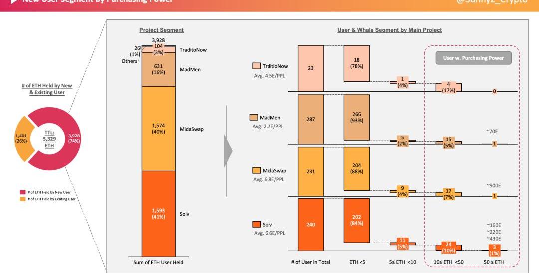 購買力新用戶中的大戶主要分布在Solv、MidaSwap、MadMen和TraditioNow等項目,人均錢包余額約46個ETH,其中Solv有多個新用戶持有超過150ETH,MidaSwap有持幣超過900ETH的大戶,如果想在聯合活動中精確觸達大戶,建議和這類項目深度合作,提供更高質量的獎勵,下圖中標記的Userw.PurchasingPower的60+用戶就是比較容易轉化的目標對象。