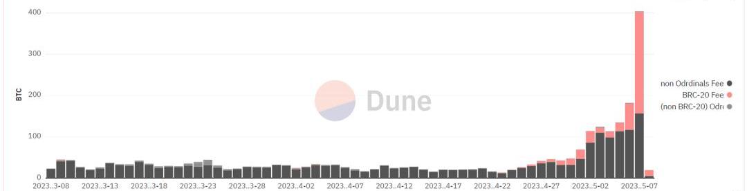 大量的BRC-20代幣交易產生的礦工費近日占據整個BTC網絡的接近30%,5月7日,BRC-20手續費占比達到歷史新高,驚人的61%。更高的費用對礦工收入和整體網絡安全都是有益的,但是對于需要日常使用BTC網絡的用戶來說無疑非常頭大。