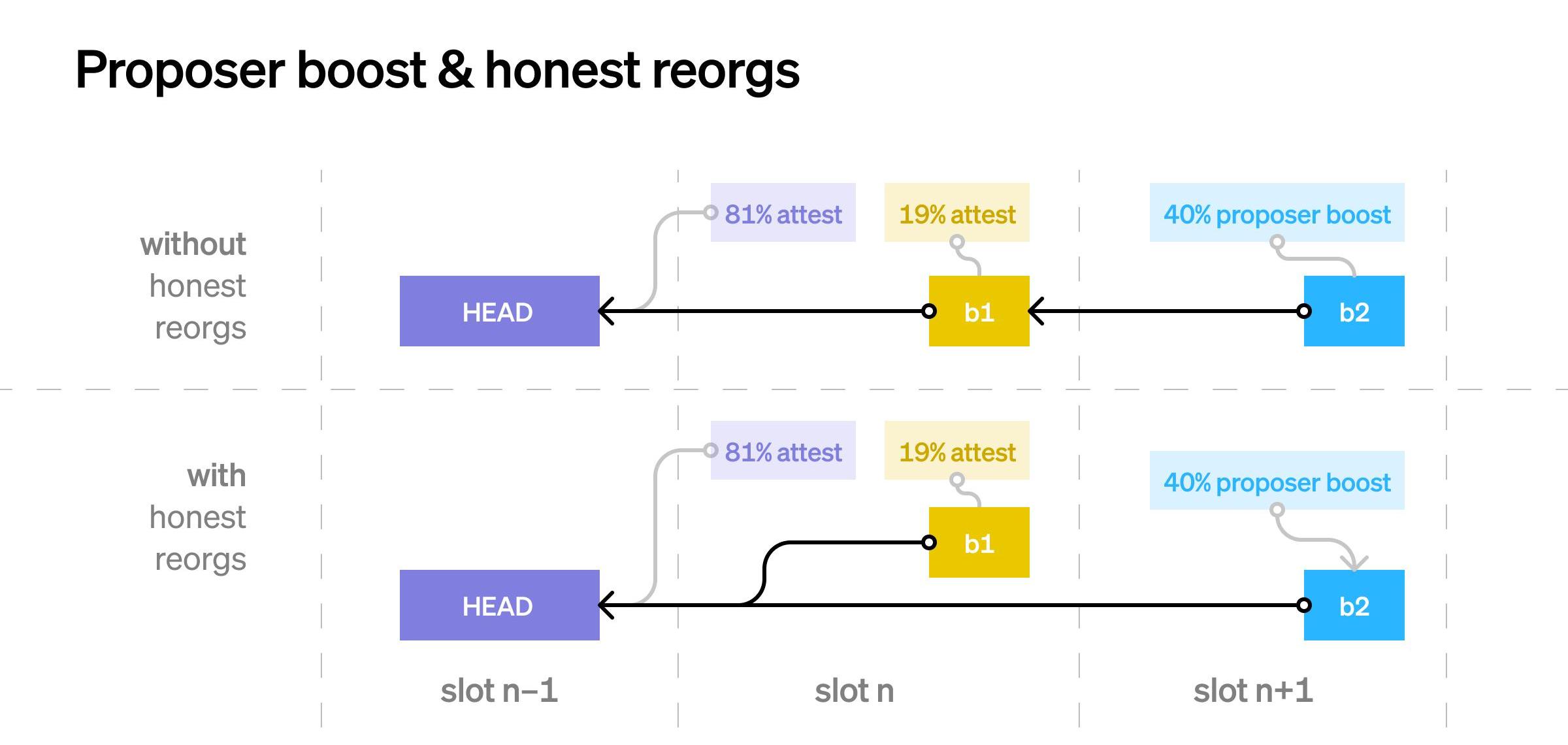 誠實的重組-采用了提議人增強并允許誠實的建議人使用它來強制重新組織具有低于20%認證權重的塊。這在Lighthouse和Prysm中實現。此更改是可選項,因為它是由建議人做出的本地決策,并且不會影響驗證器行為。因此,沒有協調努力將其同時推出到所有客戶端,也沒有與任何特定硬分叉相關聯。