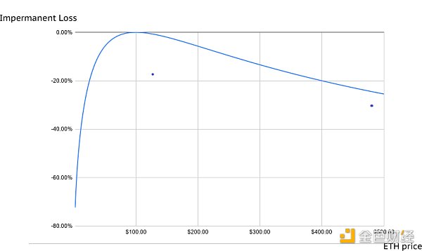 之所以稱之為 "暫時性 "虧損,是因為只要AMM內的代幣相對價格恢復到原來的價值,虧損就會消失,流動性提供者就會把賺取的費用作為利潤保留下來。然而,這樣的情況很少,這意味著大多數流動性提供者遭受的暫時性虧損超過了他們所收獲的交易費用。下圖顯示了在考慮交易費用之前,為ETH-DAI AMM池提供流動性時經歷的暫時性虧損。?