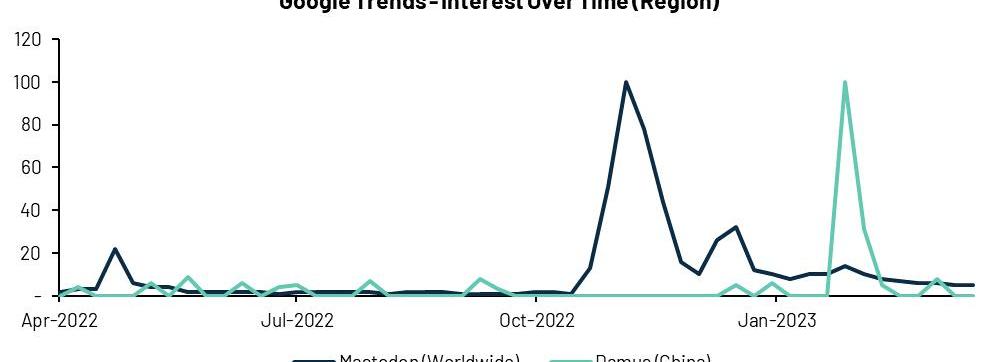 偶爾,去中心化的社交應用程序將因外部爭議或炒作而突然看到大量用戶注冊。在埃隆·馬斯克解雇數千名員工,更改驗證政策并任意添加/刪除帳戶后,Mastodon社交網絡增長了近5倍。最近,Damus突然得到了大量的中國用戶,也讓它成為了中國所有社交應用程序中排名前21的應用。