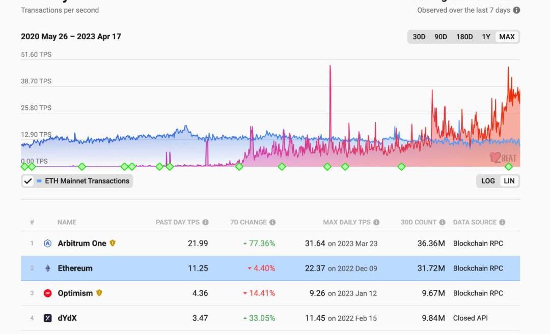 從目前的鏈上數據來看,Arbitrum無疑是最受歡迎的L2。自進入2023年以來,Arbitrum的TVL從$1b增長到了$2.3b,TPS一直處于穩步增長,近期Arbitrum的TPS約為Ethertum的2倍,Optimism的5倍,zkSyncEra的8倍,錢包地址數超500萬個,活躍地址數超400萬個,合約創建總數超200萬個,Arbitrum在各方面的數據都已經取得了領先地位。