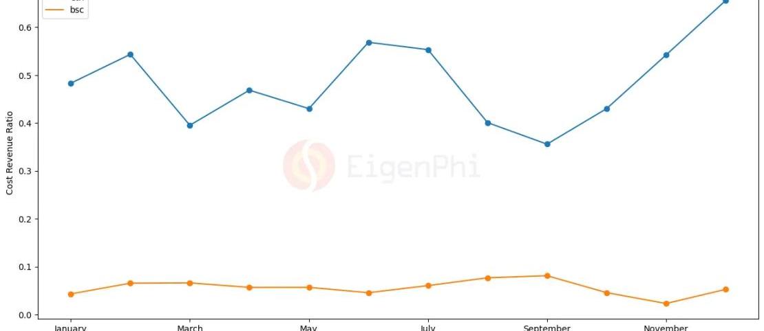 至于不同的區塊鏈平臺,BNBChain上的MEV機會比以太坊的成本效益高得多,因為BNBChain上套利機器人的平均成本收入比明顯低于以太坊。2022年,套利搜索者從BNBChain產生的總收入為9500萬美元,低于以太坊1.45億美元套利收入,但BNBChain搜索者產生的總利潤為9000萬美元,高于以太坊的7500萬美元。