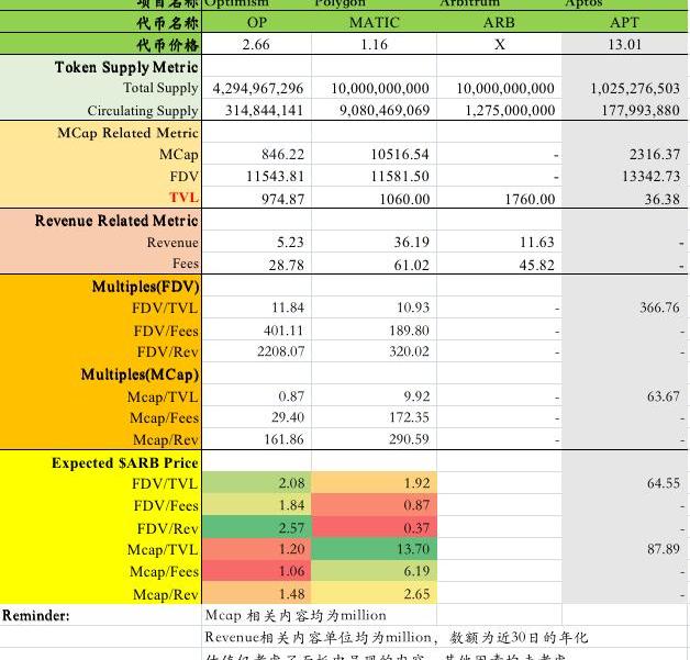 -做完還是覺得用同為L2的OP來做相對估值最合理。MATIC因為基本全流通,所以MCap過高;APT顯然不適合做對比。