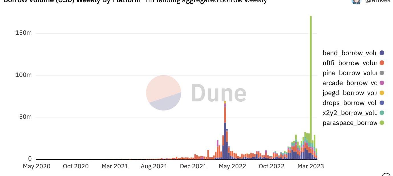 ?2023年第一季度的貸款發放額從9540萬美元激增至4.365億美元,這在很大程度上是由于NFTfi、Arcade和BendDAO等平臺的增長,它們為NFT交易者提供了獲得流動性或借高杠桿的方式。