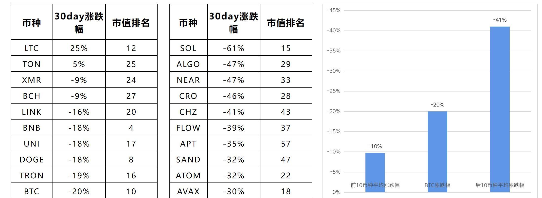 如下圖所示,FTX暴雷后的一個月,跌幅比較大的都是一些投資機構主導的幣種,這種分化是非常合理的,一是2021-2022年期間,這些機構主導的代幣抗跌本身就是不符合市場規律的,SOL之前幾乎釘死在了38U。二是VC也開始痛苦,需要變現,而他們手里只有這些幣。