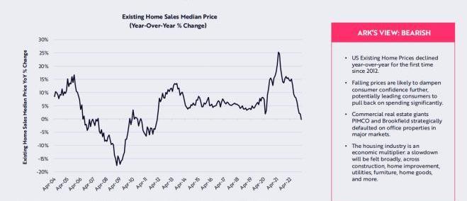 美國存量房屋價格自2012年以來首次出現同比下降。價格下跌可能會進一步打壓消費者的信心,有可能導致消費者大幅縮減開支。商業地產巨頭PIMCO和Brookfield戰略性地對主要市場的辦公物業違約。房產行業是經濟倍增器:經濟放緩將傳導至其他行業,包括建筑、家庭裝修、公用事業、家具、家居用品等等。