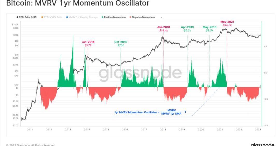 過去周期中的關鍵過渡點被顯示出來,作為衡量MVRV動量震蕩對宏觀周期變化的反應程度的一個標準。