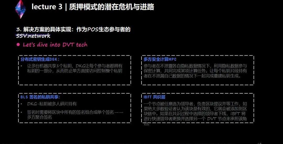 DVT的核心技術就是三個:SSV、DKG以及MPC。這三個技術是SSV的核心技術,這也是我們能夠賴以生存和在未來能夠給以太坊,或者說給以太坊的所有想要做LSD賽道的你們任何一個人的提供服務的技術基礎。