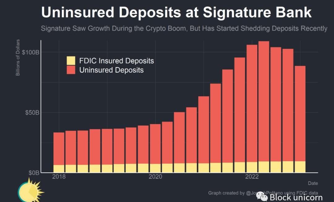 與SVB一樣,SignatureBank銀行在大流行病開始時存款增長極快,到2022年初,總存款達到2018年水平的三倍。而且,與SVB一樣,SignatureBank的絕大多數存款人的存款額超過了美國銀行賬戶的FDIC保險限額25萬美元。這是因為銀行的主要客戶是商業房地產公司、高端白領企業和私募股權公司,這些公司在大流行初期都實現了繁榮發展。然而,SignatureBank最值得關注的合作關系可能是與加密貨幣公司的合作——該公司的數字資產銀行團隊在行業繁榮初期就與加密生態系統的主要參與者合作,并開發了Signet——這是一種專有的7天24小時全年無休的區塊鏈支付網絡,服務于其機構級加密合作伙伴。SignatureBank的用戶包括行業巨頭幣安、Genesis以及現已破產的FTX和AlamedaResearch。
