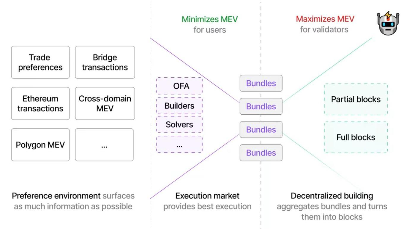 偏好環境被設想為盡可能靈活,意味著用戶不僅應該能夠表達他們對MEV的偏好,還應該能夠表達他們對區塊內任何類型的交易排序或放置的偏好。這種偏好將與競標合約相關聯,用戶將在其中鎖定一定數量的ETH以激勵對其偏好的執行,可能會復雜到區塊的狀態表示,也可能只是簡單地將某個交易打包進下一個區塊。?