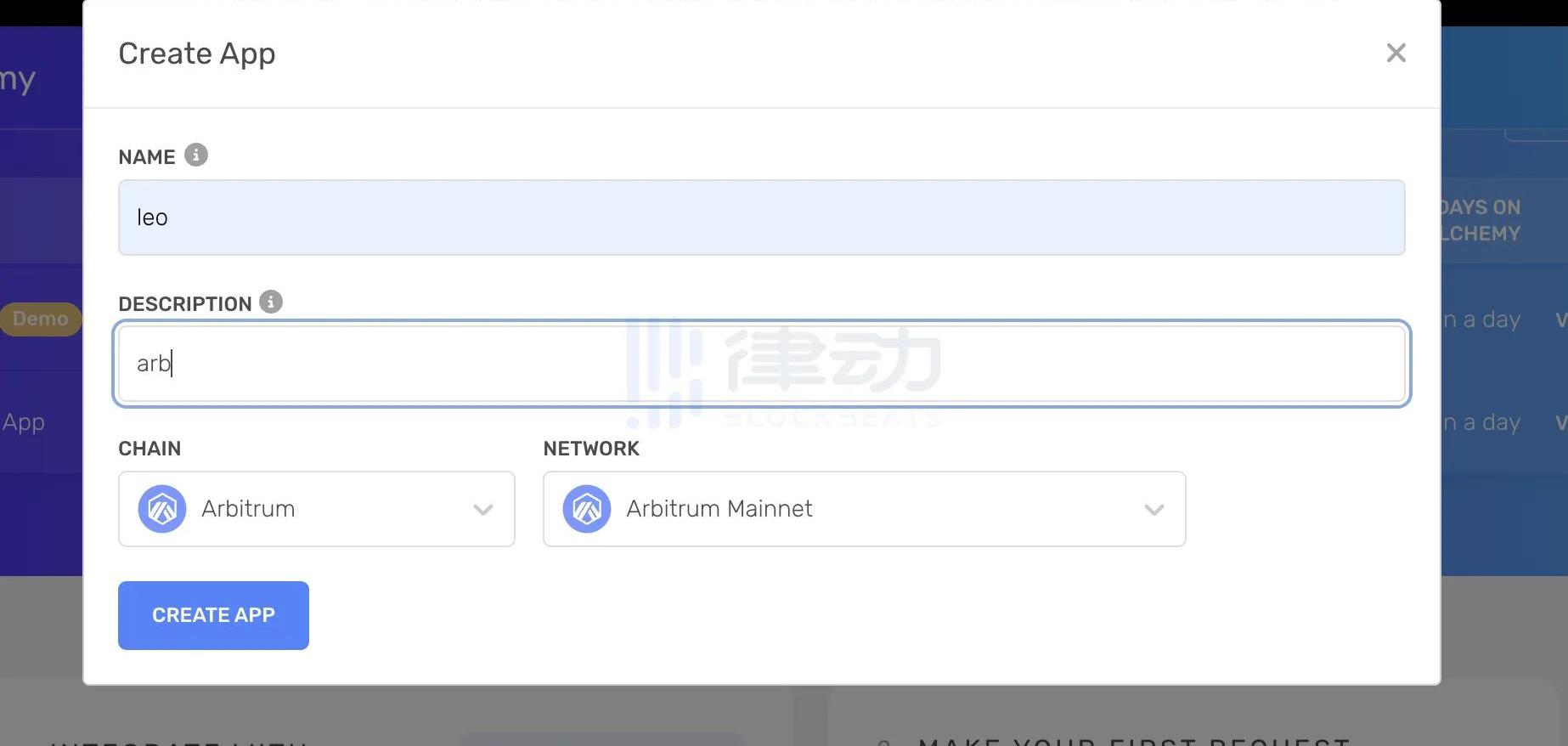 填寫相關信息,選擇ArbitrumMainnet,點擊創建應用「CREATEAPP」;