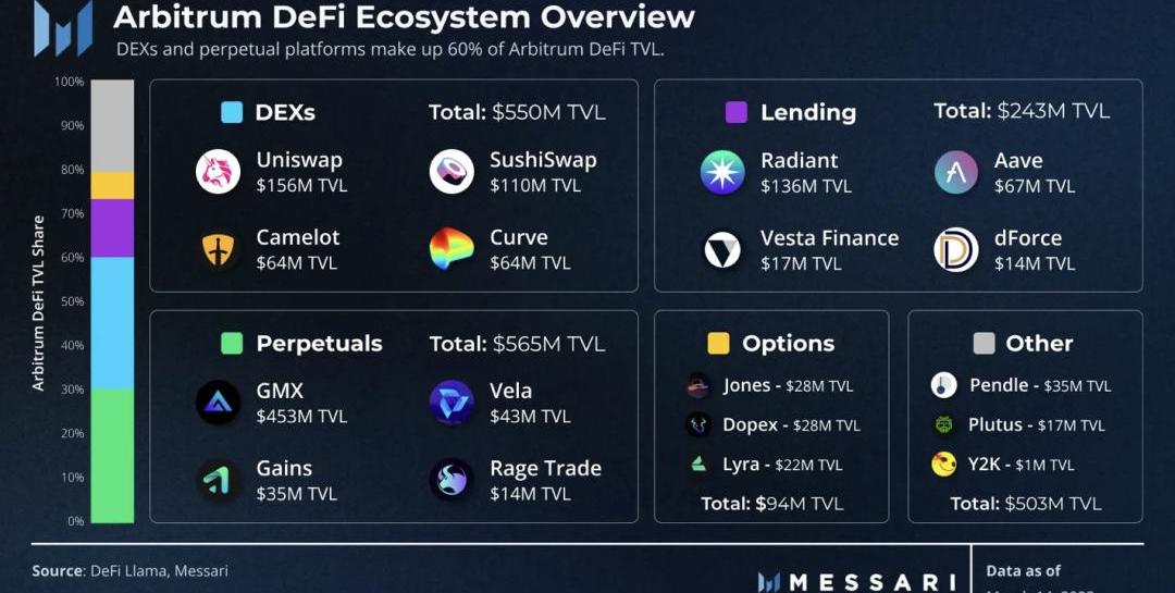 近年來,結合了自動化做市商和基于訂單簿的交易所的混合模型在DeFi用戶中越來越受歡迎。這些混合永久平臺在Arbitrum上的增長可以說是促進網絡早期采用的最重要的因素。永續合約擁有5.65億美元的TVL,是ArbitrumDeFi生態系統中最大的部分。在這一領域中,有一個協議占所有TVL的80%以上:GMX。