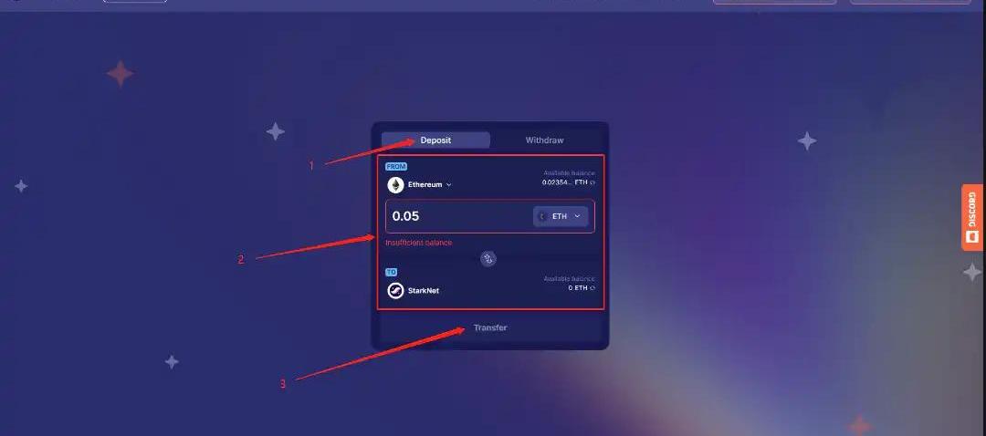 點擊Deposit,輸入存入的數量,點擊transfer存入stark主網