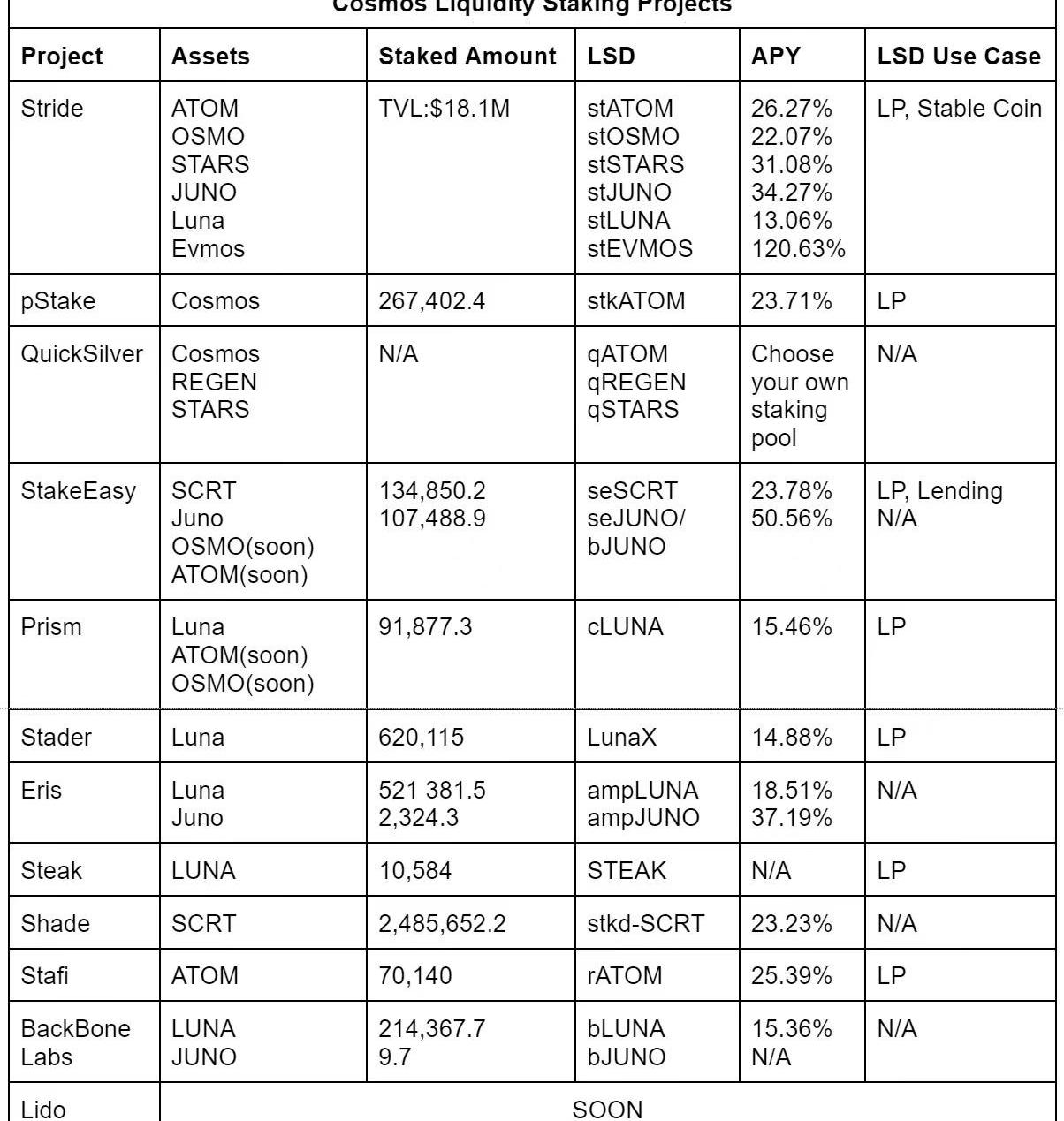 從上表格中你可以看到兩個有意思的點:Cosmos生態現在單獨拿出來一個,LSD規模都很小,而且LSD應用案例也不多,Stride作為現在的CosmosLSD老大,總TVL也才$15MLuna出現在很多LSD項目中,且擁有很多類型LSD