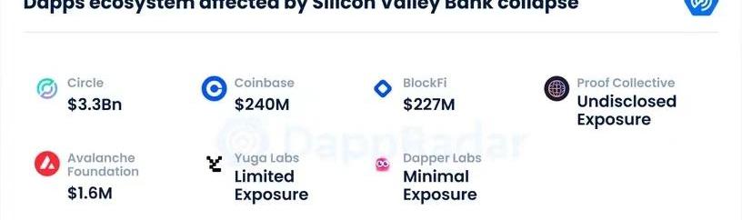 硅谷銀行的垮臺在加密貨幣社區引發了漣漪般的影響,受波動范圍包括了幾個?Dapp?生態系統。Circle、Paxos、Coinbase、BlockFi?和?Avalanche?Foundation?已經公開確認了他們的敞口頭寸。與此同時,DapperLabs、Ripple、YugaLabs、Pantera、ProofCollective、NovaLabs?和?Techteryx?只分享了他們被披露的信息。