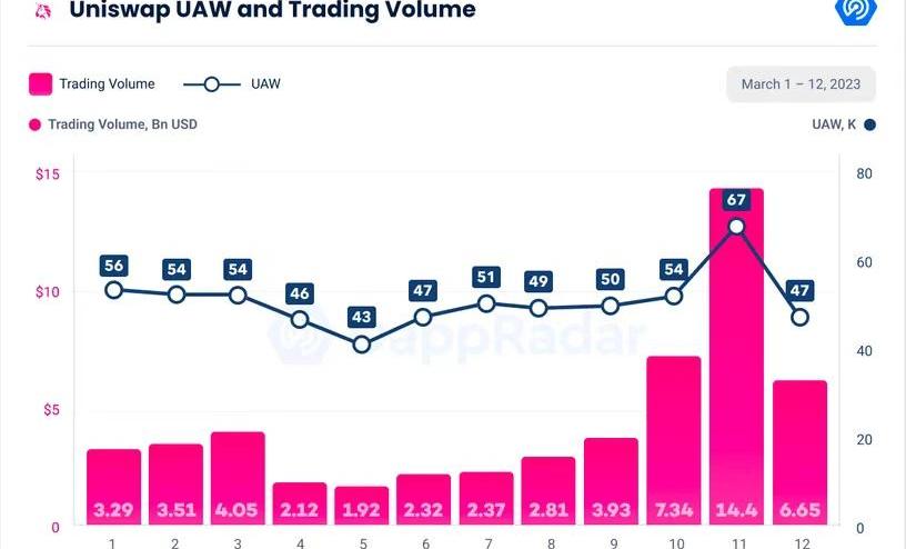 哪些?DeFi?Dapp?是造成?DeFi?鏈上峰值的原因呢?Uniswap?V3是最受歡迎的?DEX?之一,其獨立活躍錢包數量大幅增加,?3?月?11?日星期六超過了?67,?000?個,交易量達到?144?億美元,是V3有史以來注冊的最高數字。67,?000?個獨立活躍錢包是自?2021?年夏天以來?Uniswap?Dapp?上注冊的最高紀錄。