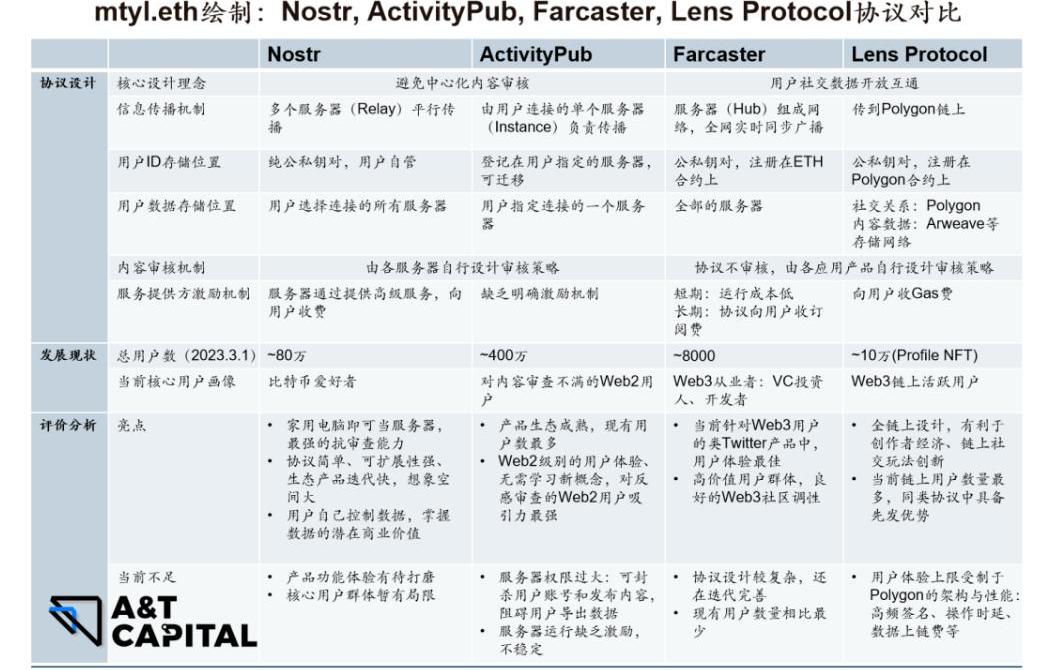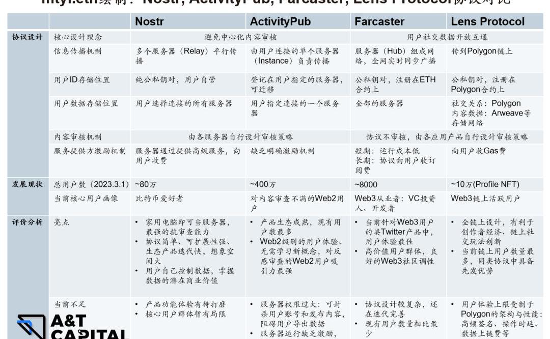 Nostr和ActivityPub設計的核心理念,都是”對抗中心化審查”。它們更強調用戶對自己內容數據的控制權,允許用戶導出自己的數據,沒有做一個公開的數據存儲網絡方便開發者調用。Farcaster和LensProtocol設計的核心理念,更在意一個開放互通、對開發者友好的用戶數據層,解決Web2社交產品相互之間的”數據孤島“問題。下面筆者將對四個協議的優缺點做一個對比總結,并對其未來一段時間的發展做出預測: