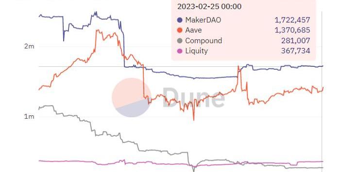 最早作為DEX的Curve一直在積極的推動自己的’穩定幣‘$3CRV,試圖將盡量多的激勵傾斜到$3CRV貨幣對上而不是單獨的穩定幣對,并且在去年最中宣布了新的超額抵押穩定幣crvUSD;TVL排名第一的通用借貸協議Aave同樣在去年夏天宣布推出其DeFi超額抵押穩定幣$GHO的計劃;而一向思路靈活的FRAX也于去年9月便推出了FraxLend,允許用戶通過支付市場利率而不是常規的鑄造機制來向官方合約借用/鑄造FRAX,其機制和MakerDAO的D3M類似。這些應用之中,MakerDAO的TVL長期占據榜首,截止2023年2月25日,其抵押金庫擁有價值82億美元的抵押物,理論上可以全部釋放成新的可供借貸的資金,如果實現將有望一舉超過Aave變身成最大的借貸協議,所以其邁向DeFi矩陣的策略將為其生態擴張打開新的想象空間。