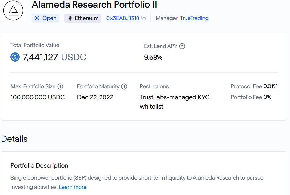 來源:https://app.truefi.io/portfolios/mainnet/0xae86120411c450bc792e7465653f99e2fe47752c