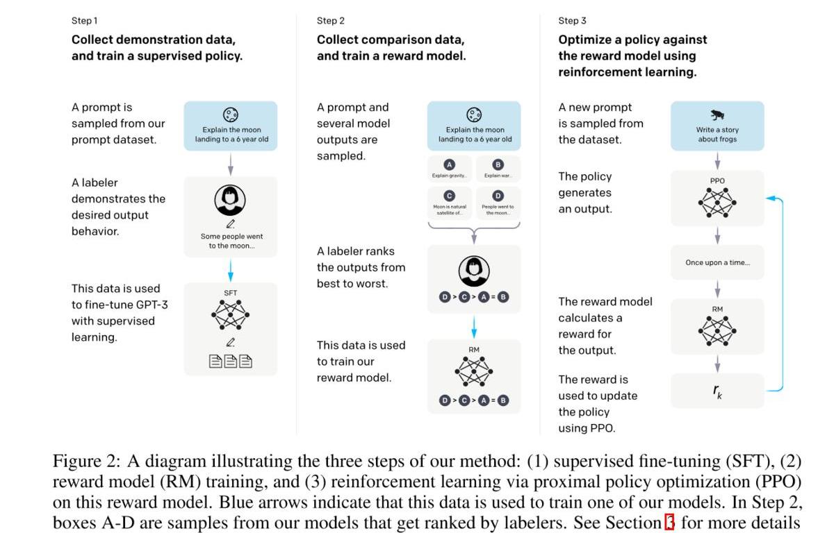 標注人員手寫(prompt,completion),然后進行SFT。這里主要是得到一個比較好的初始化模型,即模型至少能有一定的followinstruction的能力。收集模型輸出并進行打分,然后訓練一個rewardmodel。利用強化學習優化模型。