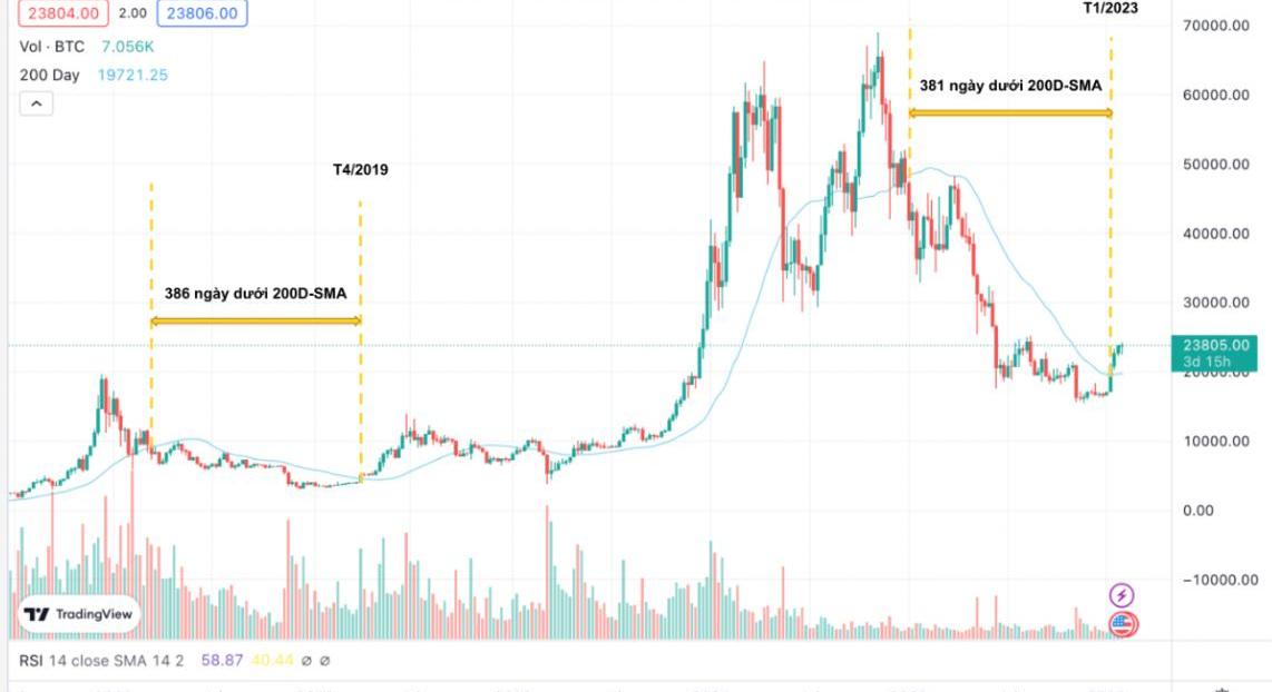 在2018-2019年的熊市期間,比特幣價格在200D-SMA下方停留了386天,然后突破并繼續上漲。2023年初,比特幣價格再次突破200D-SMA,在跌破381天后突破19,500美元,比2018-2019年的熊市少5天。