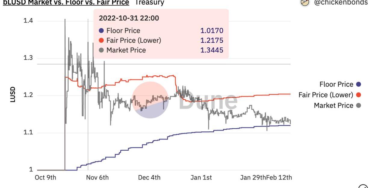 我們能說chickenbonds就已經失敗了么,現在下定論可能還為時尚早,如果chickenbonds打算將permanent池子中的lusd給到reserve池子中,就會立即大幅提升blusd的floorprice,直接對標下圖中的netassetvalue。這是一個潛在6%的漲幅收益,風險就是真正跌到目前的floorprice,有一個0.9%的下行風險敞口。