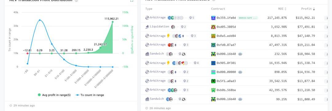 MEV合約/地址數據:中觀數據層次,包括該地址發起的MEV類型及對應的損益統計、投資回報率、經常交易代幣、接受MEV交易的礦工比例及近期該地址參與的所有MEV交易列表。如果該地址是三明治交易的受害者,還可以查詢到其在查詢時段內被攻擊的次數、損失金額及對應的三明治交易和攻擊者。