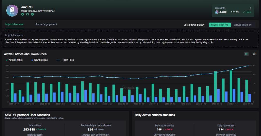 此外,在watchers上還可以查看錢包、代幣、智能合約和項目的具體情況。對于項目評估而言,因為Watchers采用的地址歸集算法可以識別多個地址背后的唯一實體,能夠方便找到“脫水后”的真實交互用戶數據,非常適合進行盡職調查。例如,對于AAVE,可以查詢其目前活躍的實體數和代幣價格。假如一個新上線項目的新增地址數為10萬個,但對應實體僅為1萬個,說明新增用戶很大可能存在刷量行為。