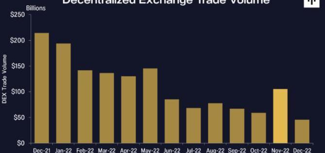 FTX之后,交易量已轉移到Coinbase和Bitstamp等受到高度監管的交易所,以及基于DeFi的去中心化交易所。以下是過去12個月內的去中心化交易量,其中11月交易量顯著上升。?